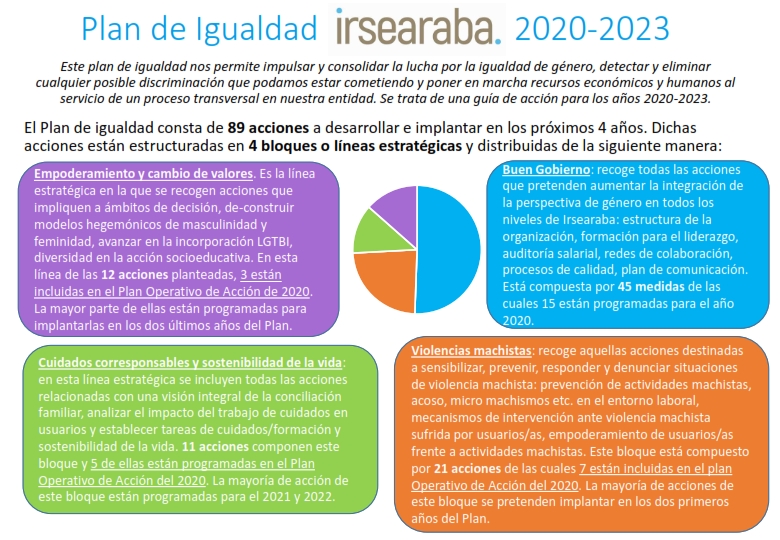 En enero de 2018 comenzamos un proceso participativo e interáreas para homogeneizar el trabajo que hacíamos en igualdad. Este trabajo conjunto de un pequeño grupo motor, nos impulsó a realizar un Diagnóstico y Plan de Igualdad un año más tarde. A día de hoy, el Plan de Igualdad no solo es un documento que de coherencia al trabajo que realizamos por la igualdad de oportunidades de mujeres y hombres, sino que es una herramienta que nos permite mejorar nuestra labor socioeducativa día a día, eliminando posibles discriminaciones y facilitándonos un ejercicio de nuestra profesión desde la autocrítica. Somos conscientes del contexto de desigualdad de oportunidades y heteropatriarcal en el que trabajamos y tratamos de eliminar esas discriminaciones en cada uno de nuestros recursos y programas.